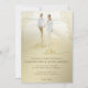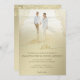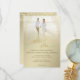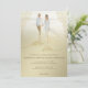 La invitación muestra una fotografía serena de la pareja en la playa, mezclándose sin esfuerzo con un suave fondo beige-oro. Las palabras "Lo hacemos" están bellamente escritas en todo el centro, añadiendo un énfasis moderno y personal. Las almendras de damasco decorativas enmarcan las esquinas superiores en oro elegante, dando un toque ornamental refinado. Los nombres de la pareja y los detalles de los bodas se presentan en un tipo de letra limpio y formal, equilibrando elegancia y legibilidad. Esta invitación combina el diseño fotográfico contemporáneo con la sofisticación clásica de los patrones adamascados, lo que lo hace ideal para bodas modernos con un aire atemporal.