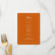 Esta carta moderna y audaz en forma redondeada presenta un marco ondulado, un guión inspirado en el retro y un menú de la cena o un menú boda con fondo Naranja quemado. Perfecto para un boda moderno o cualquier otro evento elegante. En la parte posterior hay espacio para sus nombres y fecha de boda - o simplemente borrar el texto de la parte posterior. En la herramienta de diseño se pueden cambiar todos los colores de esta tarjeta de menú boda (color de fondo, texto y marco ondulado).