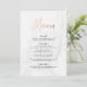 Carta de menú boda moderna y elegante, con una letra de guión de moda en rosa falso de Relieve metalizado dorado, fondo de mármol blanco y marcadores de posición para su menú casero personalizado. La parte posterior del menú boda de mármol y oro rosa se puede cambiar a un color de su elección con la herramienta Personalizar.