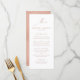 Estos modernos menús minimalistas de boda dorado y blanco y rosa personalizado le dan un toque de elegancia a los ambientes de la recepción. Esta plantilla de diseño simple incluye un guión de oro falso rosa con letras a mano que dice "Menú". Personalice las selecciones de menú. La parte posterior de la tarjeta tiene una textura metálica de oro falso rosa. Si necesitas ayuda para personalizar este menú, por favor envíame un mensaje a través de Zazzle. Gracias. Diseñado por la artista Susan Coffey.