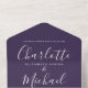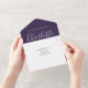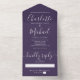 Invitación de boda moderna minimalista todo en uno que incluye elegante nombre con letra de firma y monograma sobre fondo púrpura. La invitación incluye una tarjeta de RSVP perforada. Diseñado por Thisisnotme©