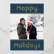 Una moderna tarjeta de vacaciones mínima con fotos familiares y Felices Fiestas en Relieve metalizado dorado. La parte trasera de la tarjeta incluye una nota de personalizable personal de vacaciones y el nombre de su familia. Si prefiere que la parte posterior de la tarjeta esté en blanco, simplemente elimine la escritura de ejemplo en los 3 cuadros de texto. Un diseño sobrio y elegante con letras de Relieve metalizado dorado en azul clásico hace que esta carta destaque.