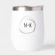 Modernos y elegantes botellas de vino personalizado hacen de los invitados un impresionante y único placer. El diseño de moda incluye sus iniciales en letras modernas dentro de un círculo abstracto de garabatos. "Saludos para amar" o su elección de texto aparece debajo, junto con su fecha de boda.