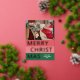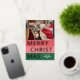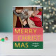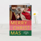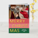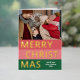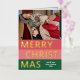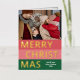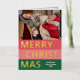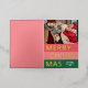 Navidades de temporada de moda única, moderna y sencilla tarjeta de felicitaciones navideñas con tu fotografía de invierno favorita y Relieve metalizado de oro real MERRY CHRISTMAS texto sobre un patrón de franjas negrita color rojo coral, rosa rubor y verde del bosque. Con espacio para personalizar o personalización con una foto y nombre de familia o nombres de su elección en la parte delantera, y un mensaje personal de bienvenida o de vacaciones en el dorso de la tarjeta.