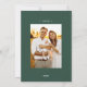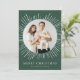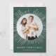 Elegante y moderna tarjeta de vacaciones con tu foto escondida en el interior de un marco circular blanco de explosión de sol. Personalice la tarjeta de Navidades de la explosión solar con su nombre familiar con letras blancas en un fondo verde o un color de su elección. La parte posterior de la tarjeta muestra el año y una foto adicional.