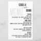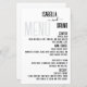 Este moderno menú boda presenta un elegante texto negro personalizado con un crujiente fondo blanco, que representa la esencia del minimalismo. El diseño es elegante y atemporal, perfecto para las parejas que aprecian la sencillez y la sofisticación. Descubra más elementos esenciales de boda en nuestra colección, incluyendo tarjetas de guardar la fecha, programas, menús, pegatinas, sobres y más. Cada artículo complementa su invitación de manera maravillosa, asegurando un aspecto cohesivo para su día especial.