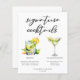 Este menú de cócteles de autor de verano presenta una tipografía negra simple sobre 2 de sus bebidas favoritas y sus ingredientes para su bar boda costero. Un dibujo de Mojito y Martini de moda le da un toque divertido a su carta de bar. Con los nombres de la pareja y la fecha de recepción.