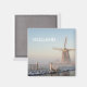 Refrigerador cuadrado imán de un molino de viento tradicional holandés cubierto de nieve en un paisaje rural en Aarlanderveen, Holanda, en invierno con la cálida luz de la mañana al amanecer. Un gran recuerdo con el texto: "¡HOLLAND!"
