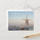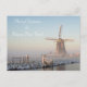 Tarjeta de navidades con un tradicional molino de viento holandés cubierto de nieve en un paisaje rural en Aarlanderveen, Holanda, en invierno con la cálida luz de la mañana al amanecer con el texto: "¡Feliz Navidad y Feliz Año Nuevo!"
