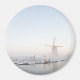 Imán fotográfico de recuerdo redondo con un molino de viento en la nieve al lado de un canal durante un amanecer nublado en invierno en los Países Bajos