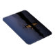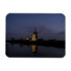 Imán fotográfico rectangular de recuerdo con molinos de viento históricos iluminados con reflexión en el agua del río durante la Hora Azul al comienzo de la noche en Kinderdijk, Países Bajos.