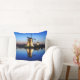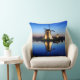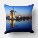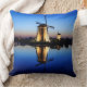 Almohada de tiro con los molinoes de viento históricos iluminados en la oscuridad durante la hora azul con la reflexión en el agua en un paisaje en Kinderdijk, los Países Bajos.