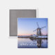 Imán fotográfico de recuerdo de un amanecer sobre los molinos de viento de Kinderdijk en los Países Bajos en invierno con algo de nieve y hielo en el agua con el texto: 'Países Bajos'.