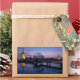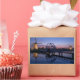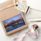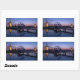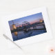 Pegatina fotográfico rectangular de dos molinos de viento iluminados y un puente levadizo con reflexión en el agua del canal a la última luz al atardecer en Kinderdijk, Países Bajos.