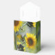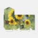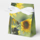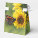 Fotografía de una mariposa monarca y girasoles expuesta en cajas de favores.