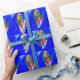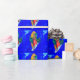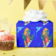 santos monjas con hábitos rojos y gorros verdes surfean olas azules