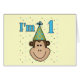 Un mono con un gorra fiesta y un texto azul que dice "I'm 1" en camisetas de cumpleaños de mono, trajes para el cuerpo, tarjetas, bolsas de té y más.