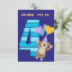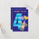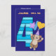 Este es un colorido diseño de invitación para fiestas de cumpleaños, con una imagen azul y verde azulada de rayas número cuatro, y un mono marrón lindo en un gorra de cumpleaños y sosteniendo globos delante de él. La parte superior de la invitación dice (Nombre) será (cuatro). La imagen y el texto se colocan sobre un fondo morado brillante. La parte posterior de la tarjeta es de color púrpura, con la información de su fiesta en blanco. ¡Maravilloso para la fiesta de cuarto cumpleaños de tu hijo! *Gracias a Real Deal Clipart por el cliente usado para crear este diseño.
