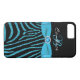 Monogramado moderno aqua azul y negro FAUX purpurina estampado de zebra patrón iPhone 7 funda con cinta IMPRESA y broche de joyas IMPRESAS. para añadir tu nombre, inicial u otro texto. Si necesita ayuda, envíe un correo electrónico a niteowlstudio@gmail.com.
