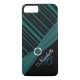 Modulación moderna de rayas verdes verde azuladas y negras patrón iPhone 7 funda con cinta verde azulada IMPRESA y broche de joyas de diamante IMPRESIONADO. ****POR FAVOR, TENGA EN CUENTA que todo se imprimirá tal como aparece en su monitor. Nadie lo editará por desalineación, tipografía, etc. para agregar tu nombre, texto inicial u otro. Si necesita ayuda, envíe un correo electrónico a niteowlstudio@gmail.com.