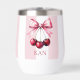 Un arco rosado con cerezas, un vaso de vino termal estético de coqueta con rayas de fondo rosas y blancas. Gran regalo para damas de honor, mujeres. Monograma con su nombre o iniciales.