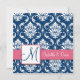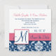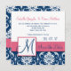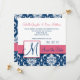 Boda elegante Guardar las tarjetas de fecha con el patrón de damasco azul y blanco de la marina, su monograma o inicial, nombres con colores de acento rosado. Diseño de la invitación a la boda por Elke Clarke ©2009. Gráficos con licencia para su uso. Personalizar con su monograma, nombres e información sobre la invitación a la boda. Además, elija entre una variedad de fuentes y hermosos papeles para hacer FABULOUS sus invitaciones a la boda! Contáctenos para ver las alteraciones en los colores en luxuryweddinginvitations@gmail.com