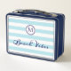 Disfrute de las pausas luminosas y brillosas para el almuerzo con esta caja de almuerzo retro de moda-playa. Con rayas azules y blancas que le dan un aire fresco y costero, la clásica caja de almuerzo metalizado se acentúa con un monograma personalizado en anillos de estilo bucal náutico. El guión de "Beach Vibes" añade un encanto relajante que hace que cada comida parezca una escapada de mar. Con un estilo atemporal y un diseño alegre, la vintage londinense es perfecta para el colegio, el trabajo, los días de playa o los picnics de fin de semana.