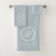 Toalla de baño de nombre familiar diseñada por un personalizado, con monograma personalizado rodeado por una elegante corona botánica blanca.