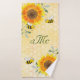 Fondo amarillo y blanco con un patrón de peine de miel. Decorada con girasoles rústicos de color agua amarillos y naranjas y abejas felices con burbujas. Añada sus propias iniciales de monograma como pareja casada. Su apellido es inicial en el medio con una letra mayúscula.
