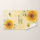 Fondo amarillo y blanco con un patrón de peine de miel. Decorada con girasoles rústicos de color agua amarillos y naranjas y abejas felices con burbujas. Añada sus propias iniciales de monograma como pareja casada. Su apellido es inicial en el medio con una letra mayúscula.