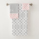 Este conjunto personalizado de toallas de baño tiene un estilo de enrejado moderno de moda en rosa rosa, gris claro y blanco. Personalízalo con un monograma clásico de 3 letras u otro texto personalizado. Utilice las herramientas de diseño para elegir cualquier color de fondo, editar los tipos de letra y los colores del texto o cargar sus propias fotos para crear un conjunto único de toallas de baño personalizado para que coincidan con cualquier decoración del baño. El conjunto incluye una toalla de baño, una toalla de mano y un paño de lavado o un tamaño de toalla individual según sea necesario.