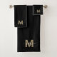 Conjunto de toallas de baño personalizadas con monograma de nombre inicial en negro, dorado y blanco. Agregue un toque de lujo y glamour a su baño con este elegante conjunto de toallas de baño. Este conjunto incluye una toalla de baño, una toalla de mano y un paño de lavado, cada uno con una inicial en dorado y un nombre en escritura blanca en la esquina inferior derecha. Tenga en cuenta que el dorado es un color plano sin acabado brillante ni metálico, lo que ofrece un aspecto sofisticado y moderno. Diseñadas tanto para uso decorativo como funcional, estas toallas son un regalo glamuroso para cumpleaños, inauguraciones, fiestas, bodas u ocasiones especiales. También son una excelente opción para un estudiante universitario que se va a la residencia o un niño que se muda por primera vez. Ya sea para uso personal o como recuerdo, este conjunto de toallas con monograma agrega un toque elegante y práctico a cualquier hogar.