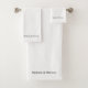 Minimalista Elegante nombres personalizados en blanco y negro monograma simple moda moderna Bath Towel Set. Personalizable de texto negro, fondo blanco de color sólido y plano. Personalizar con nombre, texto, monograma, nombres de parejas o nombre comercial.