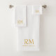 Un elegante y moderno baño con toallas minimalistas con nombres dorados e iniciales en blanco.