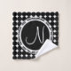 Los puntos negros en cuartos cercanos crean un patrón secundario de estrellas blancas. Un gran círculo negro está rodeado de líneas blancas, mientras que una sola inicial blanca adorna el centro.