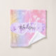 Tela de lavado alegre y adorable con un color rosa colorido, melocotón, púrpura, lila y azul de los corazones de arco iris unicornio brillantemente fondo. El nombre y el monograma personalizados están escritos en un guión elegante con letras a mano con un fondo de rastrillos de pincel de unicornio púrpura lila. ¡Un regalo perfecto de cumpleaños o Navidades!