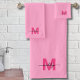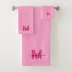 Conjunto De Toallas De Baño Monograma Con Escritura Moderna Personalizada De Color Rosa. Añade un ambiente alegre y jovial a tu cuarto de baño con este elegante equipo de toallas, perfecto para todo aquel que ame la diversión y los diseños femeninos. Con un fondo rosa brillante y feliz, cada toalla del set (toalla de baño, toalla de mano y tela de lavabo) muestra un comienzo agudo de color magenta rosado intenso emparejado con un elegante monograma de escritura negro en la esquina inferior derecha. Este vibrante y juguetón conjunto hace un fabuloso regalo para las hermanas de hermandad, una perfecta incorporación a una casa de hermandad, o un regalo para las damas de honor. También es una gran elección para un estudiante universitario que decora una habitación de dormitorio o un dulce sake para que su hijo se mude por primera vez. Ya sea para uso diario o como un accesorio encantador, este juego de toallas monogramado aporta personalidad y encanto a cualquier espacio.