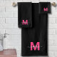 Conjunto de toallas de baño monogramo con nombre inicial caliente personalizado. Añada un toque alegre y giratorio a su cuarto de baño con este juego de toallas de baño de moda. Perfecto para los amantes de los diseños atrevidos y de diseño, este conjunto incluye una toalla de baño, una toalla de mano y un paño de lavado, cada uno con un vibrante color magenta rosa rosa inicial emparejado con un anagrama de guión negro en la esquina inferior derecha. El divertido esquema de color femenino aporta un toque de personalidad a cualquier espacio, al mismo tiempo que sigue siendo funcional y elegante. Este conjunto de toallas hace un regalo fabuloso para cumpleaños, amas de casa, vacaciones, o como regalo para hermanas de hermandad o damas de honor. También es una linda elección para un estudiante universitario que se va a la vida en dormitorio o para que su hijo se mude por primera vez. Tanto para uso diario como para un toque especial, este juego de toallas monogramadas añade un toque de glamour y encanto a cualquier cuarto de baño.