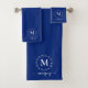 Este juego de toallas personalizado es elegante y elegante. Presenta un fondo azul real con un delicado monograma botánico blanco y tipografía de escritura blanca para su personalización.