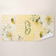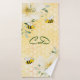Fondo amarillo y blanco con un patrón de peine de miel. Decorado con flores tropicales de color amarillo claro, color crema, hibiscos y abejas con burbujas alegres. Añadir sus propias iniciales de monograma. Letras verdes.