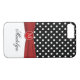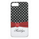 Monogramado moderno patrón de puntos de polka negro y blanco iPhone 7 funda con cinta roja IMPRESIONADA y un broche de medallón de imitador con grabado falso. ****POR FAVOR, TENGA EN CUENTA que todo aparecerá en su monitor. Nadie lo editará por desalineamiento, errores tipográficos, etc. para agregar tu nombre, inicial u otro texto. Si necesita ayuda, envíe un correo electrónico a niteowlstudio@gmail.com.