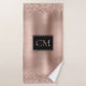 Toalla de baño lujosa colocada sobre (falso) Relieve metalizado de oro metálico de rosa con rosa de color dorado brillante bordes purpurinas. Un marco de monograma distintivo muestra sus iniciales personales o empresariales como logotipo instantáneo. Puede cambiar fácilmente las iniciales de la plantilla Personalización.