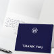 Exprese su gratitud con estilo con esta tarjeta de nota de agradecimiento minimalista azul marino. El diseño clásico y elegante presenta un monograma de personalizable con una letra en negrita blanca sobre un fondo azul marino profundo, perfecto para cualquier ocasión. Un mensaje de script de plantilla dentro del cual puede personalizar o quitar para dejar en blanco. La parte posterior tiene un medallón monograma correspondiente. Perfecto para cualquier ocasión, desde bodas hasta eventos de negocios, estas tarjetas están en blanco dentro para darle mucho espacio para expresar su gratitud.