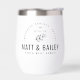 Los tambores de vino de bodas personalizados hacen un maravilloso regalo para la novia y el novio o personalizan cada uno para un único favor de fiesta nupcial para dar a sus novios, damas de honor o familiares. Este moderno diseño rústico de estilo logotipo presenta un sencillo tallo floral y una tipografía mixta. Personalice la plantilla con los nombres de la novia y del novio o iniciales de monograma. Añada su fecha de boda, la ciudad, el estado o el nombre del lugar de celebración o cualquier otro texto personalizado. Utilice las herramientas de diseño para elegir cualquier color de fondo, editar los tipos de letra o cargar sus propias fotos para crear vasos de bebida completamente personalizados para que coincidan con sus colores y estilo bodas!