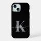 Este sencillo y elegante Funda para iPhone 15 negro con tu nombre en un tipo de letra de guión moderno escrito en blanco sobre tu primera inicial en un tipo de letra de tapa moderna en gris se vería fabuloso en tu teléfono móvil y lo protegerá de la rotura. Es de diseño y a la vez muy clásico.