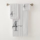 Agrega un toque de elegancia a tu baño con este juego de toallas de baño con monograma personalizado. Con un fondo a rayas gris suave y blanco, cada toalla está personalizada con la inicial de tu monograma y nombre en una fuente de escritura elegante para un look femenino y atemporal.