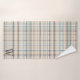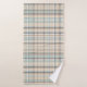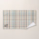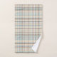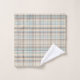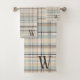 Un hermoso baño de yeso sentado, tu primer monograma está en la esquina inferior derecha. Este conjunto de paño, toalla de mano y toallas de baño tiene un diseño de manta marrón y azul. ¡Compra el tuyo hoy!