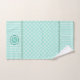 Este diseño verde de menta, alegre y luminoso, tiene rayas en la parte superior e inferior y mareas en la parte central. Las secciones están separadas por una cinta de grossgrain con guarnecido de ricrac en el centro. Puede personalizar tanto la toalla de mano como la toalla de baño con la inicial de su apellido usando el enlace "Personalizar esta plantilla".