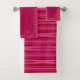 Este conjunto de toallas de baño se crea en tonos de rayas abstractas de color rosa claro y oscuro sobre un fondo de fucsia oscuro e incluye un monograma opcional sobre la toalla de mano y el paño de lavado. Utilice la opción Personalizar para cambiar las letras a sus iniciales. Utilice la opción Personalizar si necesita ajustar la posición de las letras o desea cambiar la fuente. He usado un color rosa claro para el color de la fuente para un aspecto sobrio, pero puedes cambiar el color a otra cosa (como blanco o un rosa aún más pálido) para un aspecto más audaz.