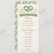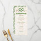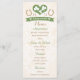 La carta del boda de St. Patrick's Day con temática shamrock Lucky In Love con un corazón verde con rocas de champú blancas dentro, el oro parece tener suerte en las herraduras y un cartel de personalizable que dice Lucky in Love. El marco de antaño con un toque de época de pergamino crema y blanco con un sutil toque de encaje damasco hace que este menú temático irlandés sea elegante y bonito. Este moderno diseño vintage es perfecto para un boda de marzo. Se puede personalizar y monogramar con el monograma y las iniciales de la novia y el novio. Shamrock y corazones patrón en la espalda. Pintura © Chrissy H. Studios, LLC. Todos Los Derechos Reservados